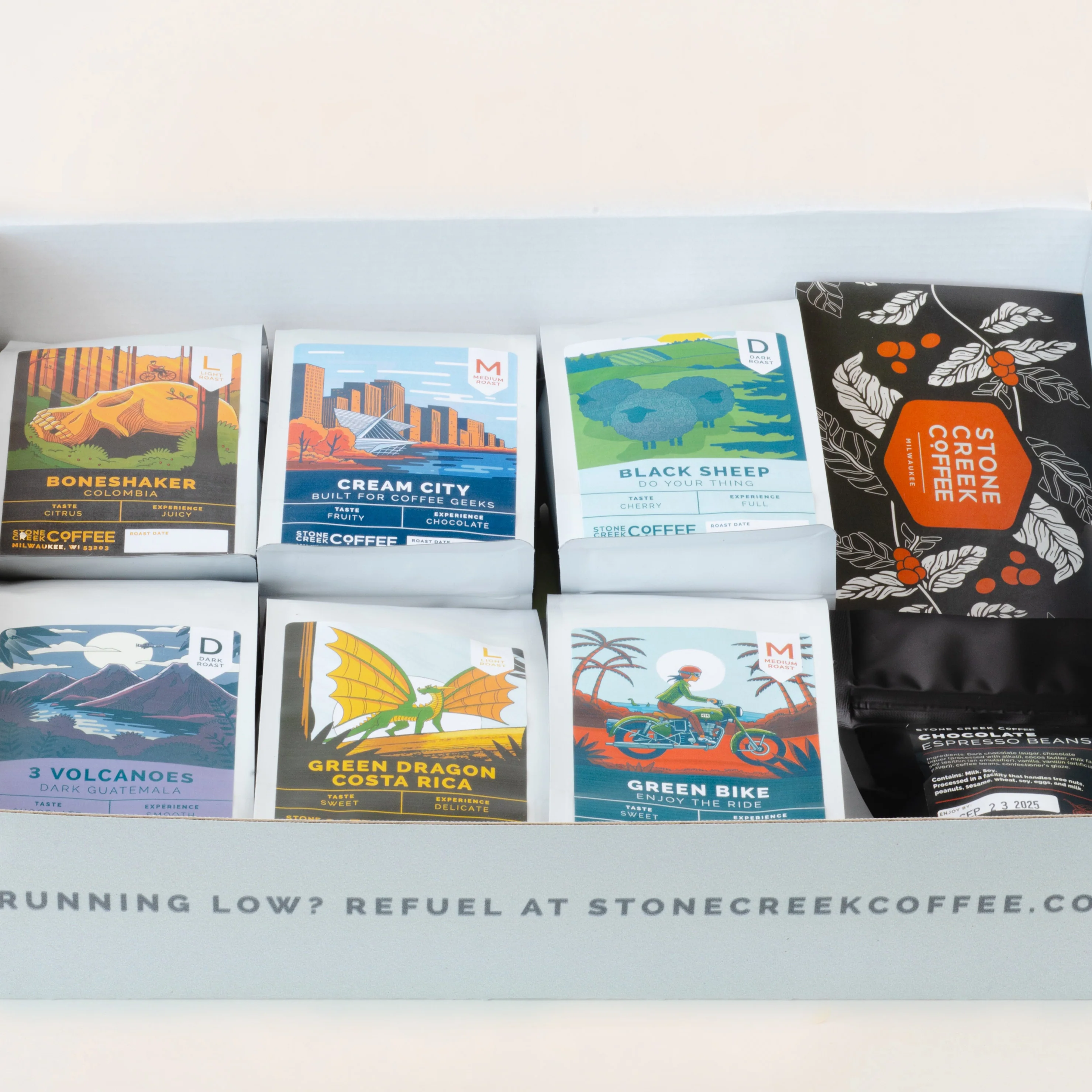 For those who believe more is always better, the Mega Coffee Sampler Box Set takes our Coffee Sampler Box to the next level. Designed for the coffee-curious and die-hard fans of Stone Creek Coffee, this mega-sized set offers an even deeper dive into our Farm to Cup selections. Perfect for gifting or expanding your own coffee repertoire, the Mega Coffee Sampler is an exploration of flavor and passion behind every roast. Because when it comes to great coffee, more is in fact better.